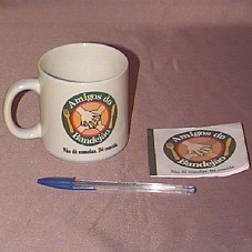 CANECA (8,5X9 CM) EM CERÂMICA BRANCA, COM ALÇA. NA FRENTE, SÍMBOLO DO PROGRAMA 'AMIGOS DO BANDEJÃO' GRAVADO E A INSCRIÇÃO 'NÃO DÊ ESMOLAS. DÊ COMIDA.'. ACOMPANHA CINCO VALES REFEIÇÃO, NO VALOR DE R$ 1,00 (UM REAL) CADA UM.