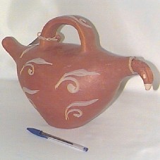 MURINGA (31X15X23 CM), FORMA EM ALUSÃO À UMA PATA (AVE), EM CERÂMICA QUEIMADA NO FORNO. POSSUI ALÇA NA PARTE SUPERIOR, E CAVIDADE NO PESCOÇO DA AVE. CABEÇA SOLTA PARA FECHAR. POSSUI DESENHOS ABSTRATOS PINTADOS EM CREME NO CORPO DO OBJETO. ACOMPANHA INFORMATIVO SOBRE A CERÂMICA, AUTOR E OBRA.