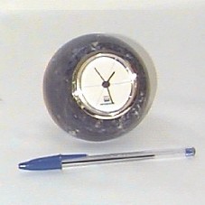 RELÓGIO DE MESA (8,5 CM), EM FORMATO DE UMA ESFERA, EM MÁRMORE AZUL, COM DETALHES EM DOURADO E TAMPO DE VIDRO. RELÓGIO COM PONTEIROS PRETOS E SÍMBOLO DA 'BR / PETROBRÁS' EM SEU INTERIOR. ACONDICIONADO EM CAIXA (9,5X9,5X8,5 CM) DE PAPELÃO AZUL MARINHO.