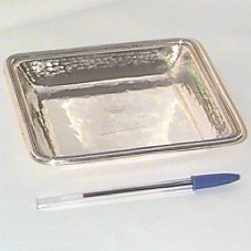 PIRES QUADRADO (16X16 CM) EM PRATA DE LEI. NO FUNDO, DESENHO DE UMA COROA REAL GRAVADO E UMA ASSINATURA 'SOFIA Q.'. NO VERSO, ETIQUETA DA FÁBRICA 'JOYERIA PEREZ FERNANDEZ / ZARAGOZA, 3 / MADRID / PLATA DE LEY'. ACONDICIONADA EM CAIXA (23,5X23X6,5 CM) AZUL MARINHO, COM DETALHES EM DOURADO, TENDO NO CENTRO DA TAMPA DESENHO DE UMA COROA.