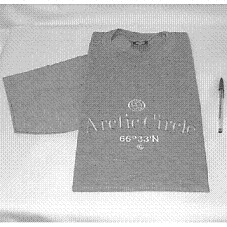 CAMISETA (TAM XX-LARGE) EM MALHA CINZA, DE MANGA CURTA. NA FRENTE, BORDADO EM CINZA E BRANCO 'ARCTIC CIRCLE / 66º 33' N' E, UM GLOBO EM AMARELO.