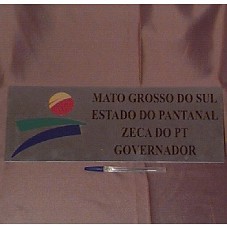 PLACA (15X40 CM) EM METAL PRATEADO ESCOVADO. COM INSCRIÇÃO EM LETRAS DE VINIL PRETA 'MATO GROSSO DO SUL / ESTADO DO PANTANAL / ZECA DO PT / GOVERNADOR'. NO CANTO DIREITO, SÍMBOLO COM CÍRCULO VERMELHO E AMARELO E DOIS RAIOS EM VERDE E AZUL.