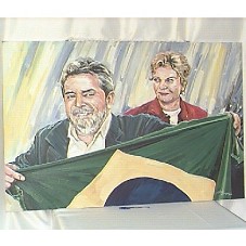 PINTURA (120X80) EM TELA, RETRATANDO O PRESIDENTE LULA (DE PALETÓ AZUL MARINHO E CAMISA BRANCA) E A PRIMEIRA DAMA MARISA LETÍCIA (DE CAMISA VERMELHA). ELE SEGURANDO A BANDEIRA NACIONAL E ELA ATRÁS DELE, OBSERVANDO-O. FUNDO COM PINCELADAS NOS TONS DE AZUL, BRANCO E AMARELO. NO CANTO INFERIOR DIREITO, ASSINATURA DO ARTISTA 'NIVALDO MARQUES / 2003'. NÃO ESTÁ EMOLDURADO.