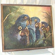 PINTURA SOBRE TELA (100X120 CM), FIGURA DE QUATRO ARARAS AZUIS EM UM BOSQUE. FUNDO COM TONS DE VERMELHO E AMARELO. PREDOMINANDO OS TONS DE AZUL, VERDE, AMARELO E VERMELHO. NO CANTO INFERIOR DIREITO, ASSINATURA DA ARTISTA 'HELENA CASTRO'. MOLDURA (108,5X128,5 CM) EM MADEIRA COM RANHURAS E ABAULADA. ATRÁS, A INSCRIÇÃO 'HELENA MARIA CASTRO / RUA CAP. MARTINHO, 590 / PARANAÍBA / MATO GROSSO DO SUL / 67- 6682439'. ACOMPANHA CARTÃO DE VISITA DA ARTISTA.