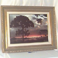 PINTURA (66X47,5 CM) DE ARAUCÁRIAS, EM UM CAMPO AO PÔR-DO-SOL. PREDOMINA OS TONS DE MARROM,VERMELHO, CINZA, AZUL E BRANCO. NO CANTO INFERIOR DIREITO, ASSINATURA DO ARTISTA 'CELITO MEDEIROS'. MOLDURA (92,5X73,5 CM) EM MADEIRA COM REVESTIMENTO EM RESINA PINTADA EM DOURADO E CINZA, E TRABALHADA EM ALTO RELEVO, COM PASSE-PARTOUT NA COR CREME E DETALHES DOURADOS.