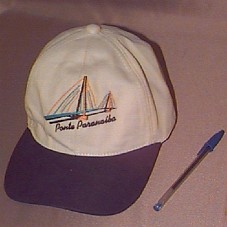 BONÉ EM BRIM BEGE, COM ABA AZUL MARINHO. NA FRENTE, BORDADO EM AZUL, LARANJA E PRETO, DESENHO DE UMA PONTE E INSCRIÇÃO 'PONTE PARANAÍBA'. ATRÁS, 'QUEIROZ GALVÃO' E SÍMBOLO DO GRUPO.