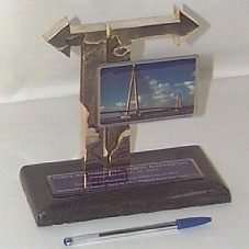 ESCULTURA EM METAL (15,5X1,5X16,5 CM), COMPOSIÇÃO DE DUAS SETAS, CADA UMA INDICANDO PARA UM LADO, E NO SEU CORPO, PARTE DO MAPA DO BRASIL ESCULPIDO. NO CENTRO, PLACA (10,5X7 CM) COM FOTO DA PONTE SOBRE O RIO PARANAÍBA. FIXADA EM BASE DE GRANITO PRETO (20X10X1,5 CM), ABAULADA NAS EXTREMIDADES, TENDO UMA PLACA (15,5X4 CM) FIXADA NELA, COM A INSCRIÇÃO 'PONTE RIO PARANAÍBA - PORTO ALENCASTRO / INAUGURADA EM 11/10/2003 / PRESIDENTE DA REPÚBLICA: LUÍS INÁCIO LULA DA SILVA / GOVERNADOR DO ESTADO: ZECA DO PT / PREFEITO MUNICIPAL: DIOGO TITA'.