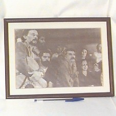 CÓPIA DE FOTOGRAFIA (26,5X18 CM) EMOLDURADA, ONDE SE ENCONTRAM O PRESIDENTE LULA, GONZAGUINHA, E OUTROS ARTISTAS. MOLDURA EM MADEIRA ESCURA ABAULADA (33,2X24,8 CM), COM PASSE-PARTOUT BRANCO E TAMPO DE VIDRO.