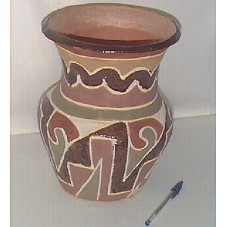 VASO (20X27 CM) EM CERÂMICA, ESTILO MARAJOARA, ABAULADO NO CENTRO, TENDO MOTIVOS DIVERSOS GEOMÉTRICOS, COM PIGMENTAÇÃO NAS CORES VERDE, AMARELO, MARROM, VERMELHO E BRANCO.