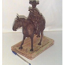 ESCULTURA DE UM CAVALO MONTADO POR UM PEÃO (26 CM). FIXADA EM BASE DE MADEIRA (20,5X13,5X2 CM), CONTENDO A INSCRIÇÃO 'PEÃO PANTANEIRO'.
