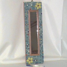 ESPELHO (6X34,5 CM) COM MOLDURA (15X50X2 CM) EM MOSAICO, EM TONALIDADES DE AZUL, COM UMA FLOR EM CADA EXTREMIDADE. MOSAICO FIXADO EM BASE DE MADEIRA. PROTEGIDO POR PANO AMARELO FURADO.