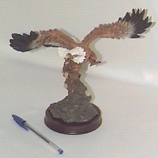 ESCULTURA (18 CM) EM RESINA, FIXADA EM BASE CIRCULAR (10X1,5 CM). FIGURA DE UM ÁGUIA, EM POSIÇÃO DE ATAQUE, EM CIMA DE UM TRONCO DE ÁRVORE PRESO A UMA ROCHA. ACONDICIONADA EM CAIXA (12,5X25,5X22 CM) VERDE COM A INSCRIÇÃO 'GIFT COLLECTIONS'. ACOMPANHA ENVELOPE COM CARTÃO DA REMETENTE 'AO NOSSO PRESIDENTE / CATARINA DE FREITAS PADILHA / FUNCIONÁRIA R.H.', 'FOI DADO UM NOVO GRITO NO IPIRANGA / DESTA VEZ NO PALÁCIO DO PLANALTO. / SUCESSO. / KÁTIA / RAMAL 2967'.