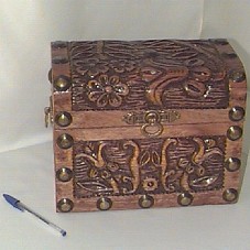 BAÚ (27,5X18X22,5 CM) EM MADEIRA ENTALHADA COM DESENHOS DE FLORES; COM DETALHES EM METAL COBREADO (PUXADOR FRONTAL, ALÇAS LATERAIS E ARREMATES DE TACHAS); FORRADO INTERNAMENTE COM FELTRO VERDE. NO FUNDO EXTERNO, GRAVAÇÃO 'ALMEIDA / RO 2003 / 069-99745302 / MV. M. RONDON 1922'. ACOMPANHA DOIS PAPÉIS, UM COM INFORMAÇÕES SOBRE O REMETENTE, E O OUTRO 'CEEJA - MARECHAL CÂNDIDO MARIANO DA SILVA RONDON / PRESIDENTE MÉDICI - RO.'.