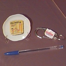 MINIATURA DE PRATO (7 CM) DECORATIVO EM CERÂMICA, COM SUPORTE DE MESA TRANSPARENTE. NO CENTRO, ADESIVO DE FUNDO AMARELO, COM DESENHO DA FACHADA DE UMA IGREJA E A INSCRIÇÃO 'OLÍMPIA / 100 ANOS / 02 MARÇO / 1903-2003'. ACOMPANHA CHAVEIRO, TIPO GANCHO, COM A INSCRIÇÃO 'COMTUR / CONSELHO MUNICIPAL DE TURISMO / OLÍMPIA SP' E 'SEBRAE SP'. ACONDICIONADO EM SACO PLÁSTICO.