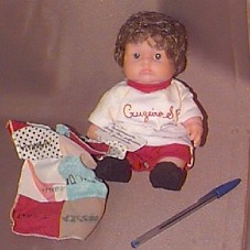 BONECO (23 CM) EM BORRACHA, IMITANDO BEBÊ, COM CABELO MARROM CACHEADO, VESTIDO DE UNIFORME: SHORT VINHO COM LISTRA BRANCA, CAMISA BRANCA COM DETALHE VINHO E INSCRIÇÃO 'CRUZEIRO SP / ESCOLA MUNICIPAL' E MEIAS PRETAS. ACOMPANHA MINI COLCHA DE RETALHOS (25,5X21 CM), POSSUINDO EM CADA UM, NOME PRÓPRIO, E UMA ETIQUETA COLADA 'CARINHOSAMENTE, SUELY, VERA, PROFESSORES, PAIS E FUNCIONÁRIOS.'. ACONDICIONADO EM SACO DE TNT NA COR MARROM.
