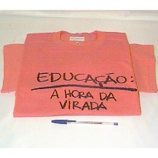 CAMISETA EM MALHA LARANJA, DE MANGA CURTA. NA FRENTE, ESTAMPA PRETA COM A INSCRIÇÃO 'EDUCAÇÃO: A HORA DA VIRADA'; ATRÁS, 'CAMPANHA NACIONAL PELO DIREITO À EDUCAÇÃO / A HORA DA DERRUBADA DOS VETOS AO PLANO NACIONAL DE EDUCAÇÃO'.