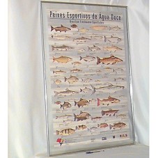 CARTAZ (62X93,5 CM) PEIXES ESPORTIVOS DE ÁGUA DOCE, COM DESENHO IMPRESSO DE VÁRIAS ESPÉCIES, CADA UMA IDENTIFICADA PELO NOME VULGAR (EM PORTUGUÊS E INGLÊS), O NOME CIENTÍFICO E LEGENDA DA REGIÃO BRASILEIRA ONDE É ENCONTRADA. NA PARTE INFERIOR, MAPA DO BRASIL COM LEGENDA MENCIONADA E SÍMBOLOS DOS PROGRAMAS PARTICIPANTES.
