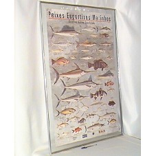CARTAZ (62X93,5 CM) 'PEIXES ESPORTIVOS MARINHOS', COM DESENHO IMPRESSO DE VÁRIAS ESPÉCIES, CADA UMA IDENTIFICADA PELO NOME VULGAR (EM PORTUGUÊS E INGLÊS) E O NOME CIENTÍFICO. NA PARTE INFERIOR, SÍMBOLOS DOS PROGRAMAS PARTICIPANTES.