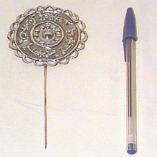 ALFINETE DECORATIVO (15 CM) EM PRATA, CABEÇA CIRCULAR (7 CM) COM MOTIVOS DE FOLHAS E FLORES EM ALTO RELEVO. ACESSÓRIO QUE PODE SER USADO EM XALES, LAPELAS, SAIAS E CABELO. ACABAMENTO MANUAL. ACOMPANHA CARTÃO DA REMETENTE, 'SUZANA DE ASSIS BOTAFOGO / COM UM CARINHOSO ABRAÇO / SUZANA'. ACONDICIONADO EM SACO AZUL MARINHO PARA PARA JÓIAS, E EM ENVELOPE PARDO, COM INSCRIÇÃO EM VINHO NA FRENTE 'JUAN DE LA TOSA / JUNCAL 1245 / BUENOS AIRES / 4811-6338' E DESENHO DE DUAS TORRES.