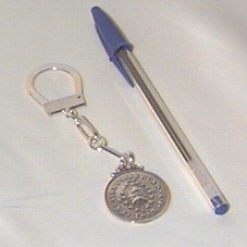CHAVEIRO (12 CM ), COM PINGENTE EM FORMATO CIRCULAR, TENDO EM UMA FACE O DESENHO DE UM SOL E A INSCRIÇÃO 'PROVINCIAS DEL RIO DE LA PLATA'; NA OUTRA, 'EN UNION Y LIBERTAD / 1813', COM FIGURA ENVOLTA EM RAMOS. ACONDICIONADO EM SACO AZUL MARINHO PARA JÓIAS E EM ENVELOPE PARDO COM INSCRIÇÕES EM VINHO 'JUAN DE LA TOSA...'. ACOMPANHA CARTÃO DE VISITA DO REMETENTE COM INSCRIÇÕES 'COM OS VOTOS DE BOAS VINDAS / JOSÉ BOTAFOGO GONÇALVES / EMBAJADOR DEL BRASIL'.