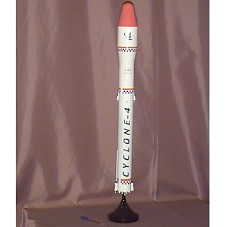 MAQUETE DO FOGUETE CYCLONE (76X8 CM), EM METAL PINTADO NA COR BRANCA, COM INSCRIÇÕES EM AZUL E DETALHES EM LARANJA E AZUL. FIXADO EM BASE CIRCULAR (13X12 CM) DE METAL PINTADO DE PRETO.
