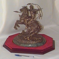 ESCULTURA (31 CM) EM BRONZE, DE UM CAVALEIRO MEDIEVAL MONTADO A CAVALO, EMPUNHANDO ARCO E FLECHA EM SENTIDO DE ATAQUE. NO ESCUDO, A GRAVAÇÃO 'BUSYPA A H / 2002'. FIXADA EM BASE DE GRANITO, DE FORMATO OVAL (28,5X22,5X3,4 CM), NA COR VERDE COM RAJADAS MARRONS. ESTA, POR SUA VEZ, COLOCADA EM BASE DE MADEIRA (43,5X34X2,5 CM), DE FORMATO OCTOGONAL, FORRADA DE VELUDO E NAPA NA COR VINHO.