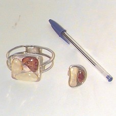 CONJUNTO DE PULSEIRA (TIPO BRACELETE) E ANEL, EM PRATA 925, COM PEDRAS DE ÂMBAR E PEDRA TIPO MARFIM.