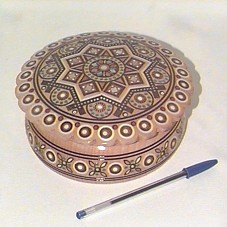 CAIXA (15X6,5 CM) EM MADEIRA CLARA, DE FORMATO CIRCULAR, COM TAMPA E DETALHES EM MARCHETARIA, METAL E MIÇANGAS COLORIDAS, INCRUSTADOS NA MADEIRA.