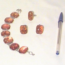 CONJUNTO DE PULSEIRA, BRINCOS E ANEL, TODOS EM PRATA COM PEDRAS DE ÂMBAR INCRUSTADAS. FABRICAÇÃO ARTESANAL.