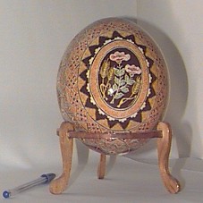 PÊSSANKA, OVO DE AVESTRUZ PINTADO À MÃO, COM MOTIVOS DIVERSOS. ACOMPANHA SUPORTE EM MADEIRA, FOLHETO INFORMANDO OS SIGNIFICADOS DOS SÍMBOLOS USADOS NA PINTURA, E CARTÃO DE VISITA DA ARTESÃ. ACONDICIONADO EM CAIXA DE PAPELÃO(16,5X15,5X21 CM) FORRADA COM PAPEL EM TONALIDADES DE LARANJA E AMARELO.