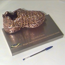 TÊNIS (20X9 CM) BANHADO EM METAL COBREADO, IMPERMEABILIZADO INTERNAMENTE, FIXADO EM BASE (25X15X2 CM) REVESTIDA COM FOLHA DE AÇO, CONTENDO A INSCRIÇÃO '100.000 PARES / BIRIGUI; CAPITAL LATINO-AMERICANA DO CALÇADO INFANTIL', E O SÍMBOLO DO PROGRAMA FOME ZERO.