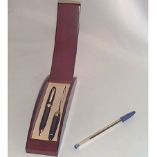 CONJUNTO DE CANETA E EXTRATOR DE GRAMPOS, COM CORPO PRETO E DETALHES EM DOURADO. ACONDICIONADO EM ESTOJO DE MADEIRA (21X6X3,5 CM), MOGNO, COM TAMPA ABAULADA, TENDO, NA MESMA, PLACA EM METAL DOURADO, DE FORMATO OVAL, COM A INSCRIÇÃO 'U.N.C. / REPUBLICA ARGENTINA'. COLOCADO EM EMBALAGEM (22X7X5 CM) DE PAPELÃO NA COR BRANCA.