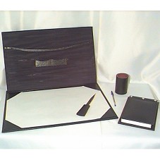 CONJUNTO DE ACESSÓRIOS PARA ESCRITÓRIO, COMPOSTO DE: UM RISQUE-RABISQUE (51,5X37 CM) COM PAPÉIS EM FORMATO A3, TENDO, NO VERSO DA TAMPA, BOLSO PARA COLOCAÇÃO DE DOCUMENTOS; UM PORTA CANETAS EM MADEIRA; UM ABRIDOR DE CORRESPONDÊNCIAS, COM LÂMINA DOURADA E CABO EM COURO PRETO; E, UM BLOCO DE ANOTAÇÕES. TODOS REVESTIDOS EM COURO PRETO, COM DETALHES EM DOURADO.