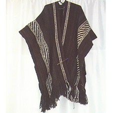 PONCHO ABERTO, EM LÃ MARROM, COM DETALHES DE FAIXAS VERTICAIS, NA COR BRANCA. POSSUI UMA ETIQUETA EM COURO, COM A INSCRIÇÃO 'PREPAP' AMARRADA NELE. ACOMPANHA CERTIFICADO DE AUTENTICIDADE, DE Nº 042363, INFORMANDO: PRODUTO, MATERIAL E ARTESÃO.