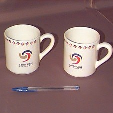 DUAS CANECAS IGUAIS (9 CM), EM CERÂMICA BRANCA, COM ALÇA. NA FRENTE, SÍMBOLO NAS CORES AZUL, VERMELHO E DOURADO,E A INSCRIÇÃO 'SANTA CRUZ / PATAGONIA'. BORDAS PINTADAS COM MESMO SÍMBOLO. NO FUNDO EXTERNO, 'CERÂMICA SYKE S.R.L. / SYKE / GRES. MADE IN ARGENTINA'. ACONDICIONADAS, SEPARADAMENTE, EM CAIXA DE PAPEL CARTÃO BRANCO (10X9,3X10,6 CM). NA TAMPA DE CADA CAIXA, UM NÚMERO: '131' E '122'.