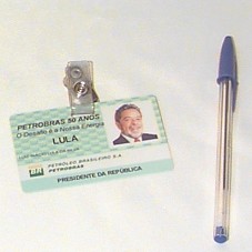 CRACHÁ (8,5X5,5 CM), TIPO CARTÃO DE CRÉDITO, TENDO COMO PANO DE FUNDO, O SÍMBOLO 'BR' DA PETROBRÁS. NA FRENTE, FOTO DO PRESIDENTE LULA, E A INSCRIÇÃO 'PETROBRÁS 50 ANOS / O DESAFIO É A NOSSA ENERGIA / LULA / LUIZ INÁCIO LULA DA SILVA / PETRÓLEO BRASILEIRO S.A. / PETROBRAS / PRESIDENTE DA REPÚBLICA'. ATRÁS, 'VÁLIDO SOMENTE NO SISTEMA PETROBRAS / COMEMORATIVA / 03/10/2003'.