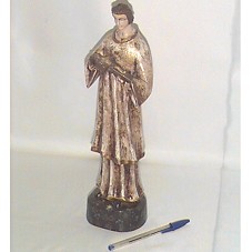 ESTÁTUA (30 CM), ESCULPIDA EM MADEIRA E PINTADA, DE UM HOMEM VESTINDO TÚNICA E SEGURANDO A IMAGEM DO CRUCIFIXO COM JESUS. BASE EM MADEIRA (9X8,5X4 CM) PINTADA EM PRETO. NO FUNDO DA BASE, GRAVAÇÃO 'PROGETO ALFABETIZAR COM SUCESSO / GOVERNO DE PERNAMBUCO / SECRETARIA DE EDUCAÇÃO E CULTURA 2003 / MANOEL E ZEZA / (087) 3842 2013'.