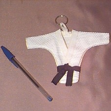 CHAVEIRO (11X16 CM) EM FORMA DE KIMONO, EM TECIDO NA COR BRANCA, COM UMA FAIXA PRETA COSTURADA. ATRÁS, ETIQUETA COM A INSCRIÇÃO '100% ALGODÃO / IPPON KIMONOS / NÃO USAR ALVEJANTES / IND. BRASILEIRA'. ACOMPANHA CARTÃO DO REMETENTE 'ILMO SR. PRESIDENTE DA REPÚBLICA, 'VERÁS QUE O FILHO TEU NÃO FOGE A LUTA!' / O ESPORTE E OS JOVENS DO BRASIL AGRADECEM TUDO QUE VOSSA SENHORIA ESTÁ POR NÓS REALIZANDO. AINDA QUE UM EXERCITO SE ACAMPE CONTRA MIM, MESMO ASSIM ESTAREI CONFIANTE NA VITÓRIA. GUSTAVO COSTA ; ASS BARRETO DE JIU-JITSU / (SALMO 27)'. ACONDICIONADO EM SACO PLÁSTICO.