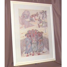 DESENHO (97,6X68,7 CM) A GRAFITE, CRAYON, SANGUÍNEA E LÁPIS DE COR, COM CENAS DE HOMENS LAVORANDO E UM GRUPO DE MULHERES QUE PARECEM ESTAR CANTANDO, COM A FIGURA DE UM ESPANTALHO NO CANTO SUPERIOR DIREITO. PREDOMINA OS TONS DE BEGE, MARROM, AZUL, LILÁS E VERMELHO. ASSINADA NO CANTO INFERIOR ESQUERDO 'PORTINARI' E, DATADA NA INSCRIÇÃO, NO CANTO INFERIOR ESQUERDO 'PAZ VI 55'. MOLDURA (130X101 CM) EM MADEIRA EMASSADA E PINTADA DE BRANCO, COM PASSE-PARTOUT BRANCO E TAMPO DE VIDRO.