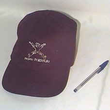BONÉ EM TECIDO AVELUDADO, NA COR AZUL MARINHO. NA FRENTE, BORDADO EM BRANCO, 'PROJETO PORTINARI' E DESENHO DE UMA CRIANÇA.