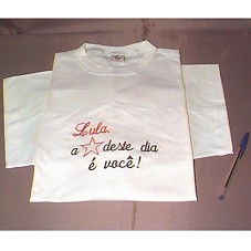 CAMISETA (TAM GG) EM MALHA BRANCA, DE MANGA CURTA. NA FRENTE, BORDADO EM VERMELHO E PRETO, 'LULA, A ESTRELA DESTE DIA É VOCÊ!'. ATRÁS, MANUSCRITO COM CANETA HIDROCOR VERMELHA, 'MACKENZIE - 2003 / PARABÉNS LULA! UM ABRAÇO! PROFESSORA ELVIRA E 4ª SÉRIE B', E ASSINATURAS DOS ALUNOS.