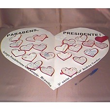 CARTAZ, EM FORMATO DE CORAÇÃO, DOBRADO NO MEIO, EM CARTOLINA BRANCA E VERMELHA. NA FRENTE, A INSCRIÇÃO 'VAMOS ABRIR O NOSSO CORAÇÃO PARA UM BRASILEIRO ESPECIAL!!'; DENTRO, 'PARABÉNS, PRESIDENTE! / COLÉGIO PRESBITERIANO MACKENZIE - BRASÍLIA / 3ª SÉRIE D / PROFª ANDRÉA CARDIM', E DIVERSOS CORAÇÕES COLADOS, COM MENSAGENS DE CADA ALUNO.