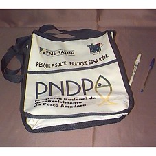 SACOLA (30X35 CM) EM LONA BRANCA, COM ACABAMENTO E ALÇA EM AZUL MARINHO. POSSUI UM BOLSO EXTERNO. NA FRENTE, ESTAMPA E INSCRIÇÃO 'PROGRAMA NACIONAL DE DESENVOLVIMENTO DA PESCA AMADORA'; E, 'PESQUE E SOLTE: PRATIQUE ESSA IDÉIA.'; A LOGOMARCA DO IBAMA/MMA E DA EMBRATUR. ACOMPANHA CANETA ESFEROGRÁFICA, COM OS SÍMBOLOS ACIMA CITADOS.