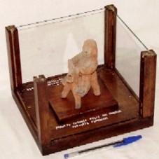 ESCULTURA (13X12X10CM) EM ARGILA RETRATANDO O PRESIDENTE LULA DOMANDO UM JUMENTO PELAS ORELHAS. ACONDICIONADA EM UMA ESTRUTURA DE MADEIRA E VIDRO TRANSPARENTE, QUE TRAZ NA BASE A INSCRIÇÃO 'PROJETO CRIANÇA FELIZ NO PARQUE / PRO-ARTE FUMDHAM / PROJETO - ELAINE IGNACIO / PROF - ELISEU LOPES DA SILVA / ESCULTURA - ALUNO GILDERLINDO P. L. SOUSA / POVOADO SÍTIO DO MOCÓ/PIAUÍ'