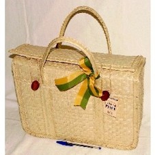 SACOLA (37X39X13CM) CONFECCIONADA EM PALHA, TRAZENDO LAÇADA EM UMA DE SUAS ALÇAS UMA FITA VERDE E AMARELA. ACOMPANHAM UM CATÁLOGO INTITULADO 'ARTESANATOS DO PIAUÍ' E UMA REVISTA INTITULADA 'IDÉIAS - ARQUITETURA E DECORAÇÃO'.