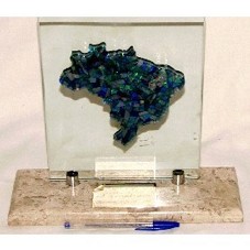 MAPA DO BRASIL (27,5X30CM) CONFECCIONADO EM LÂMINAS DE OPALAS NOBRES E EXTRAS, QUE ESTÃO ASSENTADAS ENTRE UMA LÂMINA DE VIDRO TRANSPARENTE E OUTRA DE MÁRMORE PRETO, PREDOMINANDO OS TONS DE AZUL, VERDE E ROSA. SUPORTE EM VIDRO TRANSPARENTE. BASE EM GRANITO BEGE, QUE TRAZ UMA PLACA DOURADA COM A INSCRIÇÃO 'PRODUZIDO EM PEDRO II-PI, COM OPALAS NOBRES; EM DESTAQUE O PIAUÍ, EM OPALAS EXTRAS. / TERESINA-PI, 10-JANEIRO-2002'.