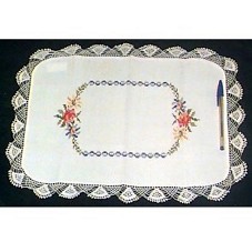 CENTRO DE MESA (33X43CM) BRANCO, BORDADO EM PONTO DE CRUZ COM TEMAS FLORAIS, COM ACABAMENTO EM CROCHÊ.