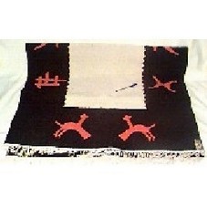 MANTA (102X170CM) CONFECCIONADA COM BARBANTE DE ALGODÃO NOS TEARES DE PEDRO II, PIAUÍ. PEÇA BRANCA NO CENTRO E PRETA NAS EXTREMIDADES, ONDE SE VÊEM DESENHOS RUPESTRES NA COR LARANJA, COMO OS ENCONTRADOS NAS CAVERNAS E PAREDES DA SERRA DA CAPIVARA, EM SÃO RAIMUNDO NONATO. ACOMPANHA FOLHETO PUBLICITÁRIO.