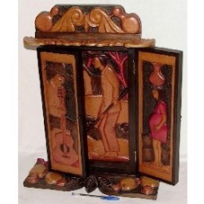 ORATÓRIO (56X41X14CM) EM MADEIRA ENTALHADA, RETRATANDO NAS PORTAS DOIS VIOLEIROS, ANVERSO, E DUAS MULHERES GRÁVIDAS COM POTE NA CABEÇA, REVERSO. NO INTERIOR, UM LAVRADOR EM UMA PAISAGEM RURAL. A PARTE SUPERIOR É ORNADA COM DUAS CABAÇAS E A BASE COM CAJUS E FOLHAS. ACOMPANHA FOLHETO DO AUTOR.