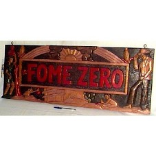 QUADRO (38X100CM) EM MADEIRA ENTALHADA TRAZENDO, EM VERMELHO, A INSCRIÇÃO 'FOME ZERO' E RETRATANDO UM SOL LADEADO POR NUVENS; UMA MULHER COM UM POTE NA CABEÇA; UM LAVRADOR; DOIS PERIQUITOS; E DUAS CRIANÇAS PRÓXIMAS A UM CURRAL. ACOMPANHA FOLHETO DO AUTOR.